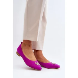 Elegantné balerínky z prírodného semišu. Mandľová špička opticky zoštíhľuje chodidlo. Mierne tvarovaná, mäkká kožená stielka poskytuje pohodlie počas používania. Ozdoba v tvare motýľa na prednej strane. Tento model má aj spevnený podpätok.