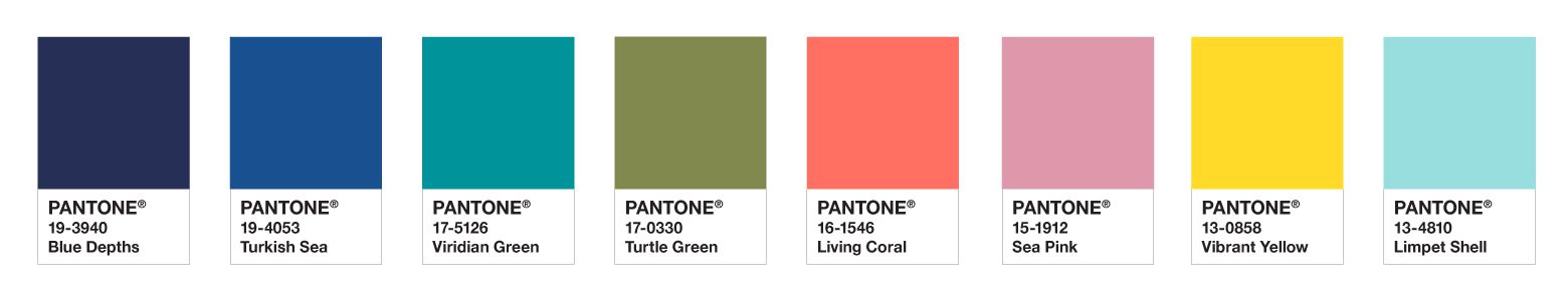 Paletu pod mořskou hladinou tvoří například: Blue Depths, Turkish Sea, Viridian Green, Turtle Green, Living Coral, Sea Pink, Vibrant Yellow, Limpet Shell.