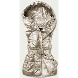 Vesta je lehce zateplená syntetickou péřovou výplní, má jednoduchý střih, dvě kapsy a zapíná se patentkami. Model má kapuci, kterou není možné odepnout. V pase je opasek. Model má délku k bokům.