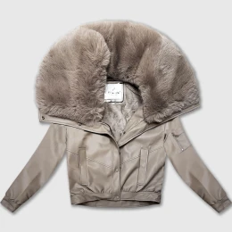 Béžová kožená bunda s veľkým kožušinovým golierom Glakate (LU98090#)