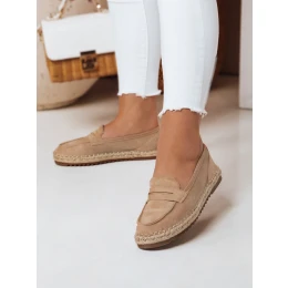 Mokasyny damskie na płaskiej podeszwie, które swoim wyglądem przypominają espadryle. Model jest wykonany z zamszowej eko skóry a wkładka ze skóry ekologicznej. Podeszwa zdobiona jutowym sznureczkiem. Klasyczny fason z modnym akcentem to must-have w każdej garderobie.