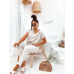 Halenka má výstřih ve tvaru písmene "V", krátké rukávy a délku k bokům.