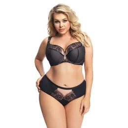 Štýlová čierna polomäkká podprsenka z novej kolekcie Gorsenia. Hladké košíčky v hornej časti zvádzajú na krásne, jemné čipkové lemovanie. Jemné saténové lemovanie elegantne dotvára dizajn. Neodnímateľné, nastaviteľné ramienka bez ramienok. Osvedčený, veľmi ženský dizajn ideálny pre väčšie prsia. Podprsenka je ideálna k jesenným svetríkom. Zloženie: 71 % polyamid, 21 % bavlna, 8 % elastan.
