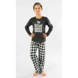 Detské pyžamo s dlhým rukávom Actual boss - chlapci. Detské pyžamo sa skladá z trička s dlhým rukávom a dlhých nohavíc. Tričko má veľký nápis Actual boss. Kárované nohavice majú elastický pás a šnúrku na stiahnutie a nemajú vrecká. Použitý materiál je príjemný a pružný na dotyk. Obsah bavlny v nohaviciach je 100 % a v tričku 70 %.