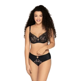 Biustonosz typu semi soft, w kolorze black. Wykonany na sprawdzonej konstrukcji K-1030. Dolna część misek została częściowo wzmocniona beżową pianką a całość obszyto czarną koronką. Biustonosz posiada ozdoby takie jak złote klamerki czy satynowe taśmy. Ramiączka – nieodpinane, szerokość dopasowana do rozmiaru, regulowane - metalowy, antyalergiczny regulator. Zapięcie – dwurzędowa, trójstopniowa haftka. Brak fiszbin bocznych.