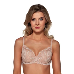 Podprsenka s vystuženými push-up košíčkami doplnenými mäkkými vypchávkami je celá pokrytá zložito tkanou čipkou. Jemné zakončenie nad okrajom košíčkov a ozdobný mostík krásne zvýrazňujú hodnoty dekoltu. Teplá béžová a ušľachtilá čierna farba umiestnená na telovej pene pôsobia mimoriadne vkusne a jemná ecru poteší očarujúcim pôvabom. Na doplnenie súpravy nezabudnite zladiť nohavičky s tangami alebo klasické plné nohavičky.