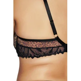 Košíčky vyrobené z polotuhej konštrukcie K-1030 vytvárajú harmonickú kompozíciu so strakatou pleteninou, bohato tkanou čiernou čipkou a jemným tylom telovej farby. Tieto prvky dokonale tvarujú poprsie, dodávajú mu príťažlivý vzhľad a zdôrazňujú ženské krivky. Dvojdielny obvod nielenže udržiava poprsie na svojom mieste, ale dodáva mu aj jemný pôvab.