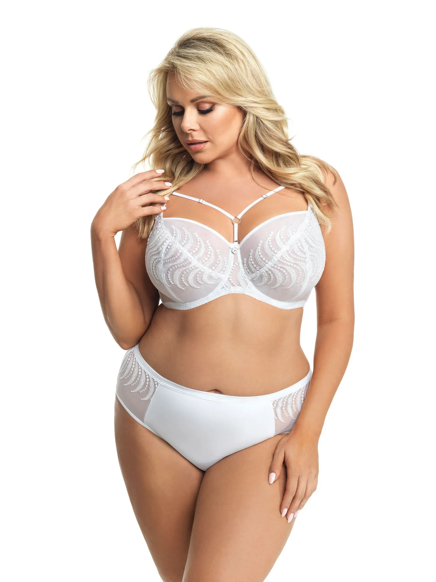 Mäkká podprsenka v základnej bielej farbe, zdobená štýlovou výšivkou, ktorá dokonale splýva s celkom. Podprsenka je vyrobená zo sieťoviny so zmyselnou, ľahkou priehľadnosťou. Horný okraj je zdobený stuhou. Ramienka majú mašličky. V strede podprsenky je zlatá visačka. Dizajn dokonale zbiera prsia od bokov, nadvihuje ich a dokonale ich prezentuje vo výstrihu, čím vytvára krásne, zaoblené poprsie. Zloženie: 90 % polyamid, 7 % elastan, 3 % polyester.