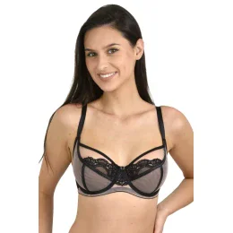 Vrchná časť košíčkov je zdobená jemnou výšivkou. Košíčky sú vyrobené z dvoch vrstiev sieťoviny. V spodnej časti má sieťovina čiernu farbu a hore farbu mocca. Vďaka farebnému prevedeniu podprsenka nepresvieti. Model zdobia regulátory a ozdoba v strede podprsenky vo farbe "golden rose". Pekný komplet je možné vytvoriť s plnými nohavičkami alebo nohavičkami typu brazílky.: