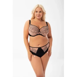 Biustonosz miękki przeznaczony dla kobiet ze średnim, dużym oraz bardzo dużym biustem. Zapewnia efekt bardzo mocnego uniesienia i zebrania biustu do środka, 3-częściowe miski wykonane z haftu podszytego tiulem stabilnym. Dla zwiększenia komfortu użytkowania górna krawędź pasa obwodu wykończona miękkimi lamówkami. Górna krawędź miski przechodzi płynnie do ramiączka powodując lepsze podtrzymanie biustu. Na baskince element ozdobny w kolorze różowego złota. Tył z kryjącej lycry o wysokiej gramaturze i sprężystości dla zwiększenia komfortu. Fiszbiny boczne zapobiegające zwijaniu się materiału. W zależności od rozmiaru dwu lub trzyrzędowa haftka z trójstopniową regulacją obwodu. Nieodpinane, regulowane ramiączka w trzech szerokościach. Metale w kolorze różowego złota (nie zawierają niklu)