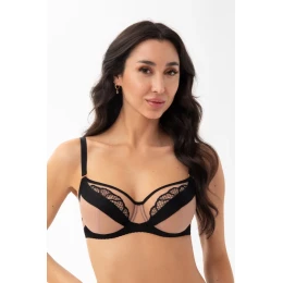 Biustonosz miękki przeznaczony dla kobiet ze średnim, dużym oraz bardzo dużym biustem. Zapewnia efekt bardzo mocnego uniesienia i zebrania biustu do środka, 4-częściowe miski wykonane z tiulu stabilnego, kryjącej dzianiny typu simplex oraz haftu. Kryjąca ukośna wstawka zasłania sutki i optycznie wysmukla sylwetkę. Górna krawędź miski przechodzi płynnie do ramiączka powodując lepsze podtrzymanie biustu. Dla zwiększenia komfortu użytkowania biustonosz na plecach wykończony szeroką taśmą elastyczną, a pachy obszyte miękkimi lamówkami. Fiszbiny boczne zapobiegające zwijaniu się materiału, w zależności od rozmiaru dwu lub trzyrzędowa haftka z trójstopniową regulacją obwodu, nieodpinane, regulowane ramiączka w trzech szerokościach. Metalowe elementy w kolorze różowego złota (nie zawierają niklu).