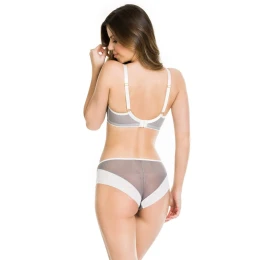 Dno košíčků ze síťoviny, horní část v oranžové květinové výšivce na šedém pozadí, ramínka a pásky v bílé barvě. Pevný síťovaný obvod poskytne maximální podporu poprsí.