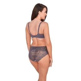 Polomäkká podprsenka s kosticami, spodná časť košíčkov z peny pokrytá efektnou čipkou, horná časť košíčkov z tylu zakončená lamówlom.