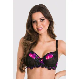 Louboutin z čierneho tylu, gore, bufetu a chrbta s fluo čipkou. Priliehavá sieťovina s čipkou poskytuje maximálnu podporu poprsiu.