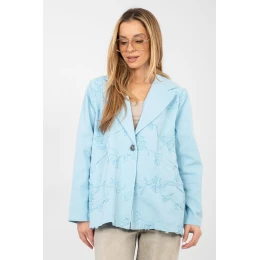 Ležérny dámsky blejzer vyrobený z kvalitnej bavlny, ideálny na každodenný styling. Džínsová tkanina mu dodáva uvoľnený charakter a zároveň z neho robí nadčasový a univerzálny model. Blejzer má štandardnú dĺžku, dlhé rukávy a klasický špicatý golier. Jedinečným prvkom sú vyšívané kvety umiestnené na prednej strane, ktoré celku dodávajú ženský a originálny vzhľad. Model sa zapína na gombík, je vybavený praktickými vreckami a spája estetiku s funkčnosťou. Je skvelou voľbou na každý deň, hodí sa k džínsom, ako aj k šatám alebo sukniam.