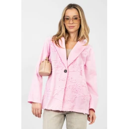Klasický dámsky blejzer vyrobený z kvalitnej bavlny, ktorý je ideálny na každodenný styling. Džínsový materiál dodáva modelu voľný charakter, pričom je nadčasový a univerzálny. Blejzer má štandardnú dĺžku, dlhé rukávy a klasický golier. Jedinečným prvkom sú vyšívané kvety umiestnené na prednej strane, ktoré celku dodávajú ženský a originálny vzhľad. Model sa zapína na gombík, je vybavený praktickými vreckami a spája estetiku s funkčnosťou. Je skvelou voľbou na každý deň, výborne sa hodí k džínsom, ako aj k šatám alebo sukniam.