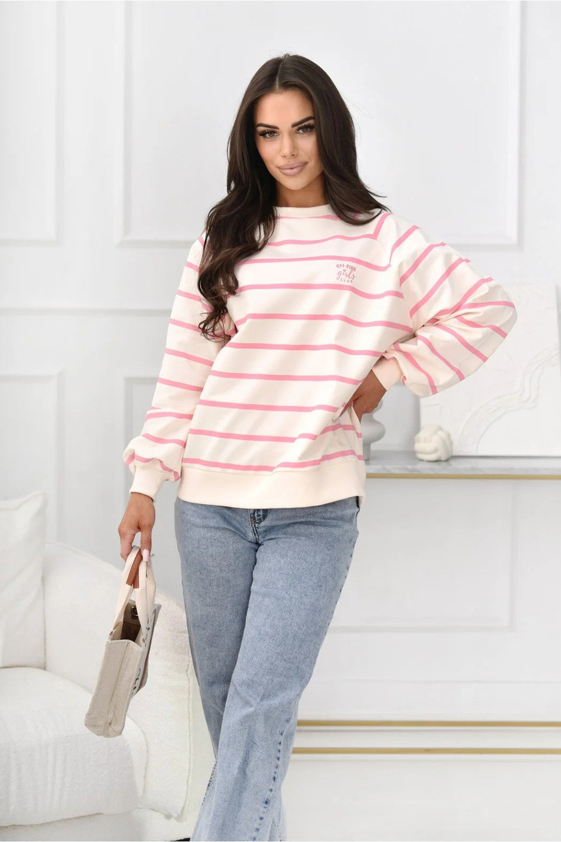 Stylowa bluza damska w poziome pasy marki Off Pink to doskonałe połączenie komfortu i ponadczasowego designu. Model o luźnym kroju zapewnia swobodę ruchów i wygodę przez cały dzień, dzięki czemu świetnie sprawdzi się zarówno podczas codziennych aktywności, jak i w casualowych stylizacjach.Bluza została wykonana z miękkiej, oddychającej dzianiny z dodatkiem elastanu, która dopasowuje się do sylwetki i gwarantuje wysoki komfort noszenia. Klasyczny wzór w poziome pasy nadaje jej modnego, uniwersalnego charakteru, a subtelne logo Off Pink na piersi podkreśla styl i oryginalność marki.Model posiada elastyczne ściągacze przy dekolcie, rękawach oraz na dole, dzięki czemu bluza dobrze układa się na sylwetce i zapewnia wygodę przez cały dzień. To idealny wybór do codziennych stylizacji – doskonale komponuje się z jeansami, legginsami oraz spodniami dresowymi. Jeśli szukasz modnej i wygodnej bluzy na co dzień, ten model Off Pink będzie doskonałym uzupełnieniem Twojej garderoby.