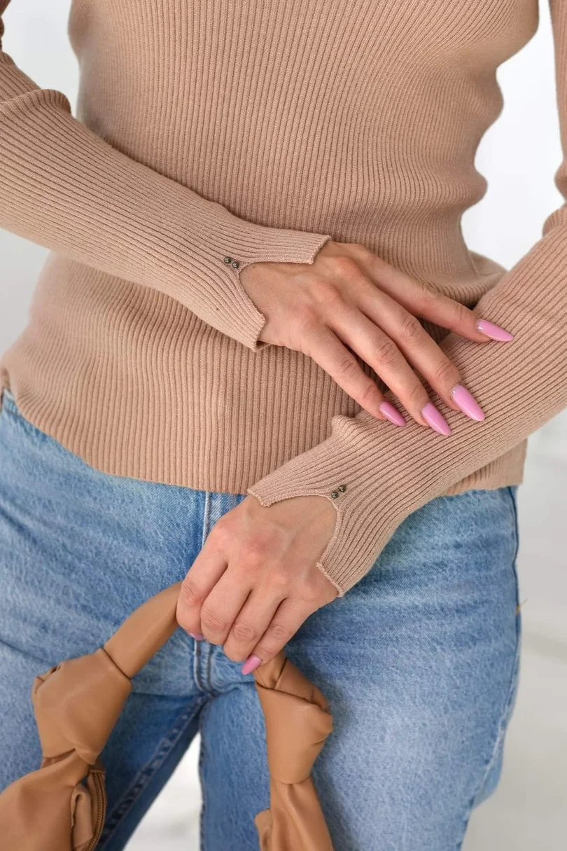 Pletená blúzka s jemným vertikálnym rebrovaním, ktoré dodáva eleganciu a jemne modeluje siluetu. Má pologuľu, ktorá dokonale prilieha ku krku, čím dodáva štýlu teplo a šik. Rukávy sú dlhé a manžety majú ozdobné trhliny s malými perlami, ktoré dodávajú blúzke moderný charakter a nádych originality. Blúzka je vyrobená z priadze, ktorá je mimoriadne mäkká a príjemná na dotyk, čo zaručuje maximálne pohodlie pri nosení. Vďaka použitiu vysokokvalitnej priadze pologuľa dokonale prilieha k telu bez toho, aby spôsobovala nepohodlie. Je vynikajúcou voľbou pre ľudí, ktorí ocenia štýl aj pohodlie.