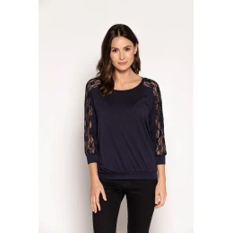 Námornícky modrá blúzka s čipkou pozdĺž rukávov, ktorá sa skvele hodí k mnohým štylizáciám. Mierne voľný strih, veľmi pohodlná, mäkká, elastická viskóza. 3/4 rukávy, mandľový výstrih, pôvabne zvýrazňujúce ramená. Perfektný návrh na jar. Elastan 5%