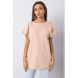 Blúzka s krátkymi rukávmi a okrúhlym výstrihom. Zadná časť s hlbokým výrezom zdobeným ozdobným volánom.