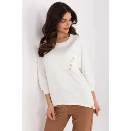 Elegantný a pohodlný top na každý deň vyrobený z kvalitnej bavlny s prídavkom elastanu. Model z hladkej tkaniny s okrúhlym výstrihom a 3/4 rukávmi poskytuje pohodlie pri každodennom nosení. Vďaka dĺžke je top ideálny k džínsom aj elegantným nohaviciam. Na prednej strane sa nachádza praktické vrecko zdobené ozdobnými gombíkmi, ktoré dodáva jemný šarm.
