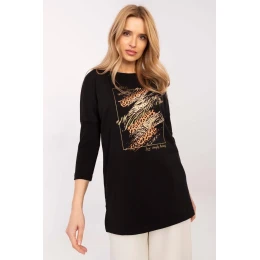 Štýlový top s predĺženým strihom, ideálny na každý deň. Vyrobený z kvalitnej bavlny s prídavkom elastanu zaručuje pohodlné nosenie a voľnosť pohybu. Model s dlhšou dĺžkou, 3/4 rukávmi a okrúhlym výstrihom sa dokonale hodí k rôznym štýlom. Dominantný vzor so zvieracím motívom na prednej strane mu dodáva módny a osobitý charakter. Perfektne sa hodí k legínam, džínsom alebo priliehavým nohaviciam, je ideálny pre ženy, ktoré ocenia pohodlie a štýl.