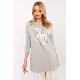 Elegantná blúzka s predĺženým strihom, ktorá sa skvele hodí na každý deň. Je vyrobená z kvalitnej bavlny s prídavkom elastanu, čo zaručuje pohodlie pri nosení a ideálny strih. Model s dlhšou dĺžkou, 3/4 rukávmi a klasickým okrúhlym výstrihom spája pohodlie a štýl. Prednú stranu zdobí jemná kvetinová potlač, ktorá blúzke dodáva ženský a romantický charakter. Hodí sa k legínam, džínsom alebo nohaviciam slim fit, čím vytvára moderný a voľný štýl.