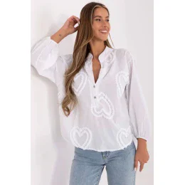 Táto elegantná a ženská boho blúzka je skvelou voľbou na každý deň, do práce alebo aj na formálnejšie udalosti. Je vyrobená z bavlneného materiálu s rôznymi textúrami, zaujme jemným spracovaním a zmyslom pre detail. Štandardná dĺžka, dlhé nadýchané rukávy s elastickými koncami a stojací golier s výstrihom do V tvoria veľmi harmonický celok. Zapínanie na dva gombíky dodáva ľahkosť a eleganciu. Je to univerzálny model, ktorý dokonale spája pohodlie s módnym a uvoľneným boho charakterom.