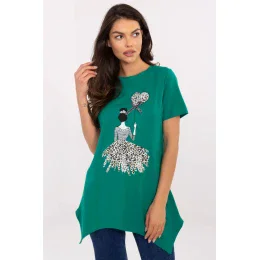 Ležérny dámsky top ideálny na každý deň, ktorý spája pohodlie s módnym vzhľadom. Je vyrobený z vysokokvalitnej zmesi bavlny a elastanu, poskytuje pohodlie a ideálne prilieha k postave. Model štandardnej dĺžky s krátkymi rukávmi a klasickým okrúhlym výstrihom. Bez zapínania sa top veľmi pohodlne nosí. Dominantný vzor a zvieracia potlač priťahujú pozornosť a aplikácie z džezvy a zirkónov dodávajú topu výnimočný lesk a originálny charakter. Skvelý dizajn pre ženy, ktoré ocenia pohodlie a módny, netradičný štýl na každý deň.