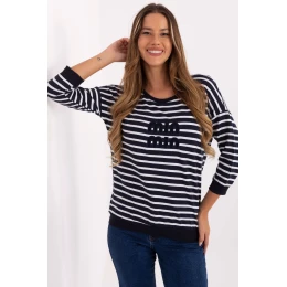 Ležérna dámska blúzka z mäkkého mikromodalu s prídavkom elastanu, ktorý poskytuje pohodlie a dokonale sa prispôsobí postave. Vďaka klasickému okrúhlemu výstrihu a dlhým rukávom je tento model pohodlný a univerzálny, ideálny na každodenný život aj do práce. Blúzku štandardnej dĺžky zdobí jemný pruhovaný vzor a aplikácie na prednej strane jej dodávajú módny a moderný charakter. Model bez zapínania, ľahko kombinovateľný s ďalšími kúskami šatníka.