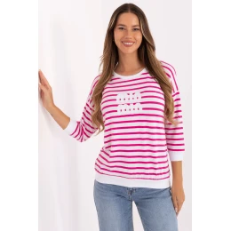 Dámsky top voľného strihu z mäkkého mikromodalu s prídavkom elastanu, ktorý zaručuje pohodlie a ideálne prispôsobenie postave. Klasický okrúhly výstrih a dlhé rukávy robia z modelu pohodlný a univerzálny kúsok, ktorý sa skvele hodí na každodenné nosenie aj do práce. Top má štandardnú dĺžku a zdobí ho jemný pruhovaný vzor, aplikácie na prednej strane dodávajú topu módny a moderný charakter. Model bez zapínania, ľahko sa kombinuje s ďalšími kúskami v šatníku.