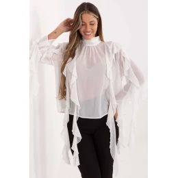Elegantní dámská blůza je ideální volbou na každý den, na společenské události a na večírek, kdy chcete zdůraznit svůj styl subtilní, ale efektní formou. Její hladký vzor dodává celku eleganci a umožňuje snadné doplnění jak elegantními kalhotami, tak sukní. Model je vyroben z příjemné směsi viskózy a polyesteru, díky čemuž je blůza měkká, lehce pružná a krásně padne na postavu. Standardní délka a dlouhý rukáv dodávají blůze elegantní a univerzální vzhled. Roláček zdůrazňuje krk a přidává trochu elegantní tajemnosti, a zapínání na knoflíky na krku usnadňuje oblékání a představuje jemný dekorativní akcent. Blůza zaujme také výjimečnými detaily, ozdobnými volány na zádech, přední části a rukávech, které jí dodávají lehkost, romantický charakter a módní eleganci. Jedná se o skvělou volbu pro ženy, které rády kombinují subtilní klasiku s efektními, ženskými detaily.