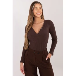 Štýlový a pohodlný top s ležérnym charakterom, ideálny do práce aj na každý deň. Je vyrobený z bavlny s prídavkom elastanu, čo zaručuje pohodlie pri nosení, pružnosť a dokonalé prispôsobenie sa postave. Materiál je pruhovaný, čo dodáva topu jemnú štruktúru a zvýrazňuje jeho moderný vzhľad. Top má štandardnú dĺžku a dlhé rukávy, vďaka čomu je vhodný na mnohé štylizácie aj počas chladnejších dní. Výstrih do V je zdobený ozdobnými gombíkmi, čo dodáva celému kúsku elegantný, ženský akcent. Dominantný vzor je jednofarebný, vďaka čomu je top univerzálny a ľahko kombinovateľný s inými kúskami šatníka. Ideálny základ na mnohé každodenné štylizácie, pohodlný, ženský a všestranný.
