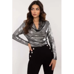 Elegantná blúzka so sofistikovaným charakterom, ideálna na návštevy a večierky. Je vyrobená z lesklého materiálu zo zmesi polyesteru a viskózy, ktorý priťahuje pozornosť a dodáva stylingu šmrnc. Blúzka má bohatú štruktúru materiálu, čo jej dodáva jedinečný vzhľad. Má dlhé rukávy a splývavý výstrih, ktorý krásne sedí na postave a dodáva celku ľahkosť a eleganciu. Ozdobné záševky na materiáli vnášajú do outfitu ďalší prvok elegancie a zdôrazňujú jeho originálny dizajn. Štandardná dĺžka zaručuje, že blúzka je ideálna na rôzne stylingy.