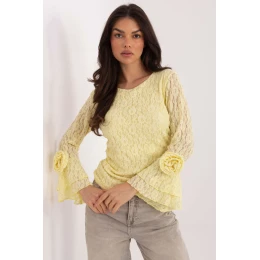 Elegantní krajková halenka je stylovým návrhem, který se skvěle hodí jak na speciální příležitosti, tak do každodenních outfitů. Vyrobená z vysoce kvalitního materiálu kombinujícího polyester s elastanem, poskytuje pohodlí a dobře padne k postavě. Různorodá textura materiálu dodává halence výjimečný charakter a decentní eleganci. Model s krátkou délkou, kulatým výstřihem a bez zapínání vypadá lehce a moderně. Dlouhé zvonové rukávy jsou zdobeny efektními volány a ozdobným látkovým kvítkem, které přitahují pozornost a dodávají celku romantický nádech. Přední část halenky má podšívku, zatímco rukávy a záda zůstávají jemně průhledné, zdůrazňujíce krajkový charakter modelu. Další sběry po stranách halenky decentně tvarují postavu. Halenka se skvěle hodí jako součást výstavního outfitu, na večírek, do práce, stejně jako do každodenního nošení, v kombinaci s kalhoty s vysokým pasem, sukní nebo elegantními džínsy.