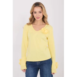 Elegantná blúzka s dlhým rukávom a priliehavým strihom, ktorý účinne zvýrazňuje postavu a spája klasické a ozdobné detaily. Je vyrobená z kvalitnej bavlny, poskytuje pohodlie pri nosení a príjemne sedí počas celého dňa. Model s hladkým vzorom má výstrih do V, ktorý jemne zvýrazňuje krk a dodáva mu ženský charakter. Dlhé zvonové rukávy dodávajú celku ľahkosť a eleganciu a ozdobné látkové kvety umiestnené na rukávoch a okolo výstrihu sú výnimočným dekoratívnym prvkom. Štandardná dĺžka zaručuje, že blúzka je ideálna na každodenný styling, do práce, na stretnutia, ako aj na elegantné večierky alebo udalosti.