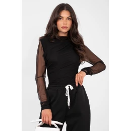 Elegantní, přizpůsobená dámská blůzka je výjimečným návrhem pro ženy, které ocení styl a všestrannost. Skvěle se hodí na slavnostní příležitosti, do práce, na večírek, stejně jako do každodenních elegantnějších stylizací. Hladký vzor zdůrazňuje její nadčasový charakter a umožňuje snadné kombinování s ostatními kousky šatníku. Blůzka je vyrobena z vysoce kvalitního polyesteru s přídavkem elastanu, co zajišťuje elasticitu, pohodlí nošení a dobře padnoucí střih. Krátká délka jemně zdůrazňuje proporce a průhledný, kulatý výstřih dodává celku jemnost a ženskou eleganci. Model má dlouhé rukávy z síťoviny bez podšívky, které dodávají lehkost a efektní vzhled. V prostřední části je blůzka vybavena podšitím, které zajišťuje pohodlí a dostatečné krytí. Další výhodou je drapování, které krásně tvaruje siluetu a zdůrazňuje elegantní charakter blůzky. Bez zapínání je model pohodlný a snadný na nasazení. Jedná