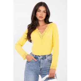 Přizpůsobený každodenní top je ideální volbou pro ženy, které ocení pohodlí spojené s jemnou elegancí. Model v casual stylu se skvěle hodí jak do každodenního života, tak do práce, vytvářejíc estetické a ženské outfit. Hladký vzor a proužkovaná struktura materiálu dodávají topu moderní a zároveň univerzální charakter. Top je vyroben z elastické a příjemné směsi polyesteru a elastanu, což zaručuje pohodlí a skvělé přizpůsobení k postavě. Standardní délka umožňuje perfektní sladění s různými typy kalhot a sukní. Stylovým prvkem jsou dlouhé rukávy zakončené jemnou krajkou a výstřih v srdcovém tvaru lemovaný krajkou, které dodávají celku ženský půvab a lehkost. Bez zapínání zdůrazňuje jednoduchost střihu a pohodlí nošení. Jedná se o top, který spojuje každodenní pohodlí s elegantními detaily, ideální pro mnoho outfitů.