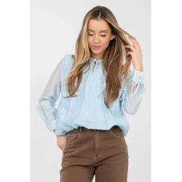 Táto elegantná dámska blúzka je skvelou ponukou na každodenný život, do práce alebo na slávnostné udalosti. Je vyrobená z kvalitného materiálu z kombinácie tencelu a polyesteru, ktorý poskytuje pohodlie, priedušnosť a estetický dojem počas celého dňa. Model štandardnej dĺžky s dlhými rukávmi a klasickým golierom pôsobí mimoriadne štýlovo a nadčasovo. Blúzka nemá zapínanie, čo jej dodáva minimalistický charakter a uľahčuje obliekanie. Hladký vzor podčiarkuje eleganciu strihu a ozdobné gombíky sú decentným dekoratívnym prvkom. Ďalšou výhodou je podšívka v strednej časti, ktorá zvyšuje pohodlie a estetiku nosenia. Ideálna na kombinovanie s elegantnými nohavicami, sukňami alebo sakami.