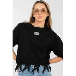 Top pre ženy v každodennom ležérnom štýle, ktorý je ideálny na pohodlné, ležérne outfity. Je vyrobený z kvalitnej bavlny s prídavkom elastanu, vďaka čomu poskytuje pohodlie, pružnosť a skvele prilieha k postave. Model s krátkou dĺžkou a krátkym rukávom sa skvele hodí na teplejšie dni. Okrúhly výstrih dodáva topu klasický a univerzálny charakter. Na prednej strane sa nachádza malá aplikácia, ktorá jemne oživuje jednoduchý strih. Ďalšou výhodou je vyšívaný lem v spodnej časti topu, ktorý dodáva celku jemný ženský nádych. Top sa skvele hodí k džínsom, šortkám a sukniam a vytvára jednoduché, každodenné zostavy.