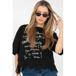 Dámska blúzka na každý deň so ženským a štýlovým charakterom. Je vyrobená z kvalitnej bavlny s prídavkom elastanu, čo zaručuje pohodlie pri nosení, pružnosť a dobre padnúcu siluetu. Model s krátkou dĺžkou a krátkymi rukávmi je ideálny na teplejšie dni. Okrúhly výstrih zdôrazňuje klasický strih a dodáva blúzke univerzálny vzhľad. Ozdobný nápis na prednej strane doplnený zirkónmi priťahuje pozornosť a dodáva celku módny nádych. Ďalšou výhodou je čipkový lem v spodnej časti blúzky a jemné zirkóny, ktoré jej dodávajú ženský lesk. Ideálna na každodenný outfit k džínsom, šortkám alebo sukni.