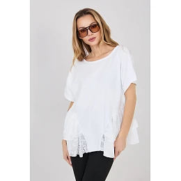 Blúzka na každodenné nosenie vyrobená z kvalitnej bavlny, ktorá zaručuje pohodlie počas celého dňa. Model má hladký, minimalistický vzor, vďaka ktorému sa ľahko kombinuje s mnohými štýlmi, ležérnymi aj elegantnejšími. Blúzka má klasický okrúhly výstrih a krátke rukávy, takže je ideálna na teplejšie dni. Štandardná dĺžka sa dobre prispôsobí postave a umožňuje nosiť ju s nohavicami aj sukňami. Model nemá zapínanie, takže je pohodlný a ľahko sa oblieka. Ako ďalší ozdobný prvok má v spodnej časti jemný vyšívaný volánik, ktorý dodáva blúzke ľahký a ženský charakter.