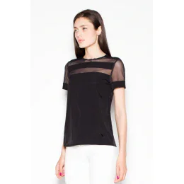 Elegantná blúzka s krátkymi rukávmi a polguľatým výstrihom. Ozdobné priehľadné prvky vo výstrihu a na rukávoch. Model vyrobený z kvalitného materiálu.
