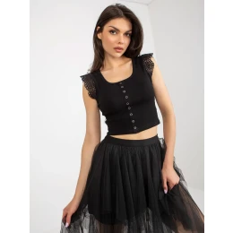 Čierna rebrovaná blúzka s čipkovanými rukávmi.