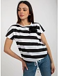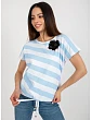 Biela a svetlomodrá pruhovaná blúzka s brošňou .