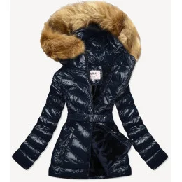 Tmavomodrá lesklá zimná bunda s machovou kožušinovou podšívkou (w673)