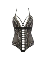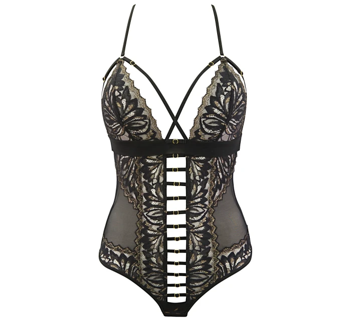 Toto romantické čierno-zlaté body je kombináciou klasickej čiernej farby a jemných zlatých prvkov, ako aj zaujímavých ozdôb. Vďaka čipkovanej aureole sa diváci môžu kochať pohľadom na vašu hladkú pokožku a ženský vzor a saténové mašličky podčiarkujú zvodný charakter návrhu. Dvanásť pásikov spája strednú časť body a každý z nich má zlaté ozdoby, ktoré vás rozžiaria. Rovnaké ozdoby na trojitých pásikoch nájdete aj na spodnej časti chrbta. Model má prekrížené ramienka zapínané na háčik na úrovni pŕs a v rozkroku. Nemá žiadne drôtiky.