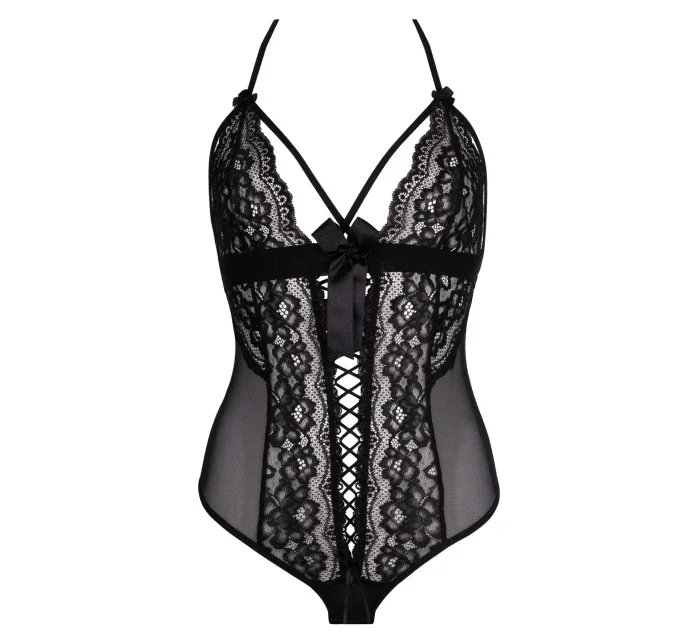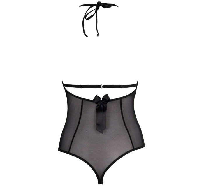 Černé romantické body Irresistible V-6690 je kombinací klasické černé barvy a jemného, ale zajímavého zdobení. Krajkové prošívání vám umožní vychutnat si pohled na hladkou pokožku, zatímco ženský vzor a saténové mašličky podtrhují svůdnost tohoto modelu. Model se zavazuje za krkem a zapíná se v rozkroku a na zádech. bez drátů