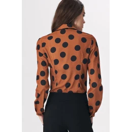 Košeľová blúzka je skutočnou nevyhnutnosťou pre jemný kancelársky štýl. Originálna kombinácia teplej hnedej a čiernej farby a vzor veľkých bodiek rozbíja klasický kancelársky vzhľad. Praktický strih body sa dokonale prispôsobí telu a umožní vám užívať si nielen pôsobivý vzhľad, ale aj pohodlie počas celého dňa.