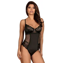 Pôsobivé body ideálne nielen do spálne. Model je navrhnutý tak, aby vyhovoval aj potrebám doplnenia jedinečného dámskeho šatníka. K dispozícii je aj vo väčšej veľkosti. Jedná sa o dizajn, ktorý nádherne zvýrazňuje zadok, bohato zdobený ušľachtilou čipkou, takže vyzerajú veľmi zvodne. Predná časť je založená na konštrukcii podprsenky s kosticami v spodnej časti košíčkov, čo umožňuje dobré zhromaždenie a zvýraznenie pŕs. Mäkká tkanina sa dokonale prispôsobí a opticky zoštíhli telo. Pohodlné zapínanie v rozkroku, nastaviteľné ramienka.